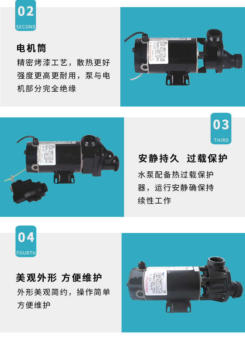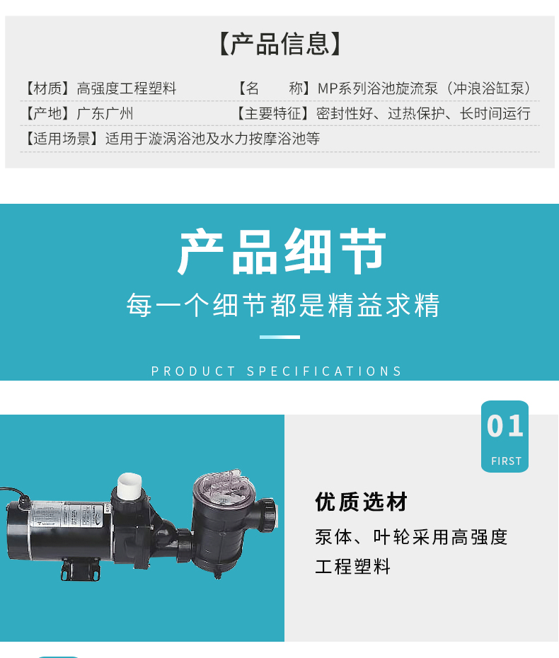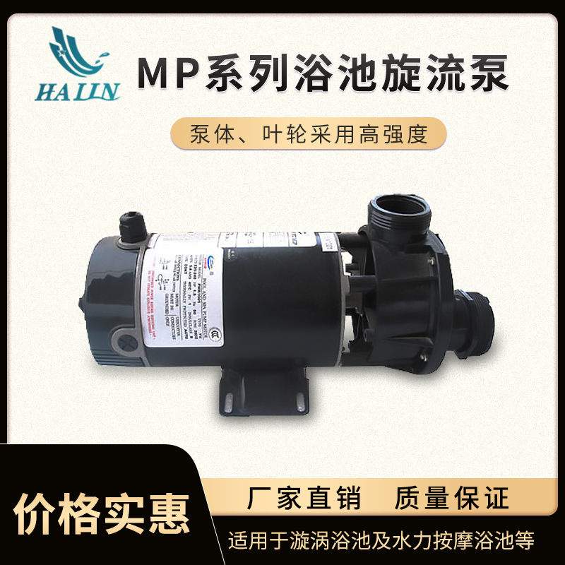 - MP系列浴池旋流泵(沖浪浴缸泵),泵體、葉輪采用高強度工程塑料。泵與電機部分完全絕緣,單相馬達安裝熱保護器,可長時間連續運行。配氣動開關操作,確保使用方便安全。