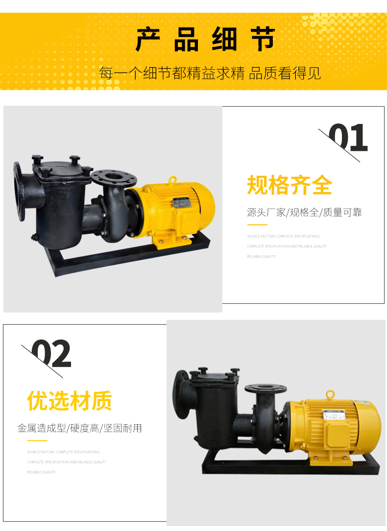 根據水力學原理設計的泵體,用金屬造成型,堅固的一體式結構,經久耐用。濾籃容量大,大大減少了清洗工作。性能好,效率高,加快了注水(灌溉)速度并提高了能源效率。適用于各種泳池、工業用水、海洋館、水上樂園等。