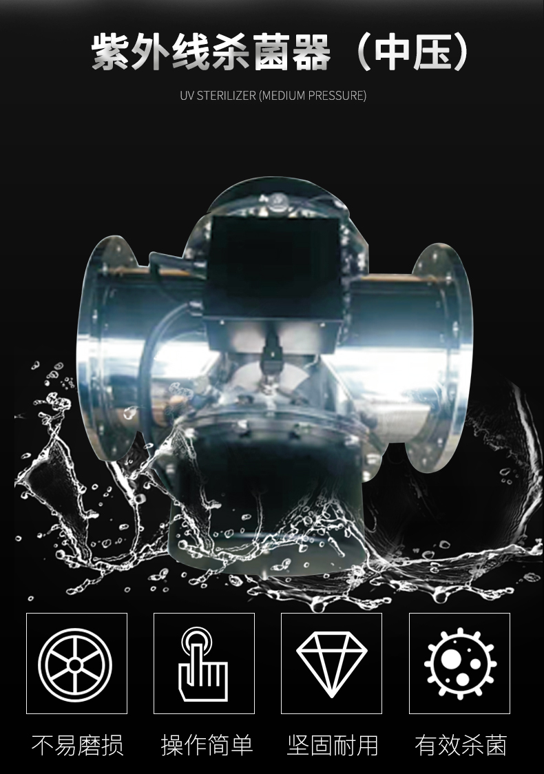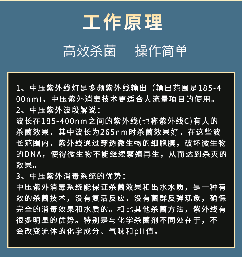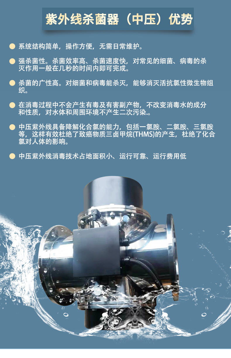 - 中壓紫外線殺菌系統(tǒng)的中壓紫外燈輸出波長(zhǎng)的范圍較寬,對(duì)細(xì)菌和病毒可以起到殺滅效果,能夠滅活抗氯性微生物組織,列如大腸桿菌,隱孢子蟲,阿米巴蟲和細(xì)菌等。在消毒過(guò)程中不會(huì)產(chǎn)生有毒物和有害副產(chǎn)品,安全環(huán)保。