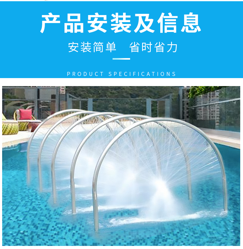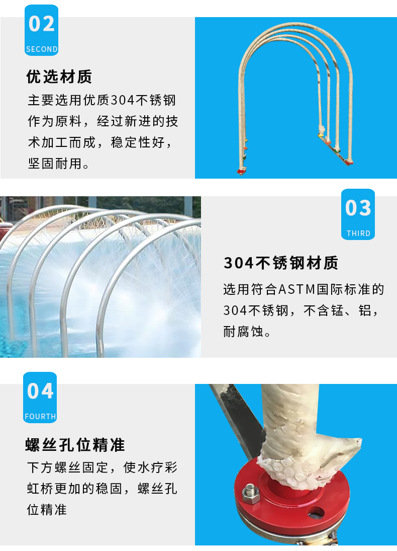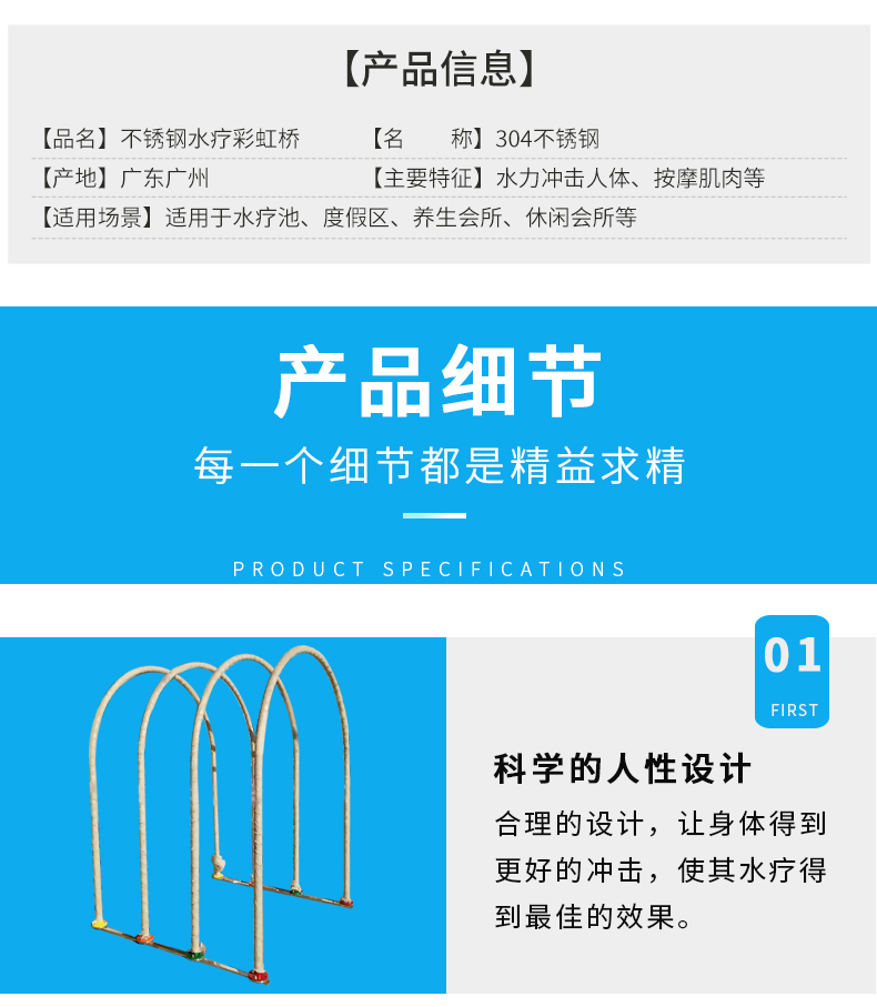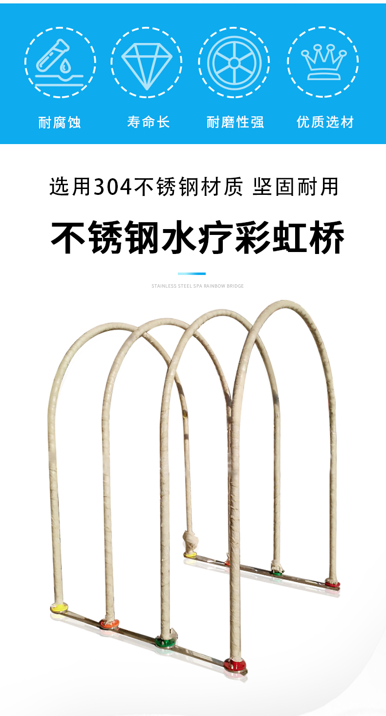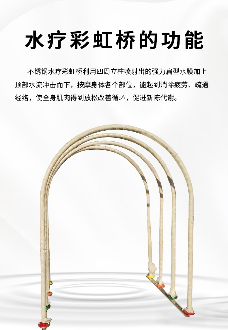 不銹鋼水療彩虹橋利用四周立柱噴射出的強力扁型水膜加上頂部水流沖擊而下,按摩身體各個部位,能起到消除疲勞、疏通經絡,使全身肌肉得到放松改善循環,促進新陳代謝。